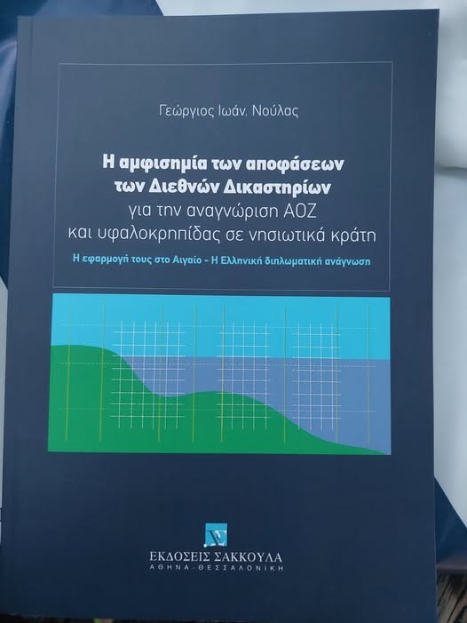 Με αίσθημα δικαίωσης αλλά και βαθιάς επιστημονικής ευθύνης, η έκδοση του βιβλίου «Η αμφισημία των αποφάσεων των Διεθνών Δικαστηρίων για την αναγνώριση ΑΟΖ και υφαλοκρηπίδας σε νησιωτικά κράτη – Η εφαρμογή τους στο Αιγαίο» του Γεωργίου Ιωάν. Νούλα αποτελεί την κορυφαία επιστημονική στιγμή της πορείας του συγγραφέα. Πρόκειται για ένα έργο υψηλής νομικής ανάλυσης που εστιάζει στη χωροθέτηση των θαλάσσιων ζωνών, αναδεικνύοντας την πολυπλοκότητα αλλά και την αμφισημία της διεθνούς νομολογίας στην επίλυση κρίσιμων διεθνών διαφορών.